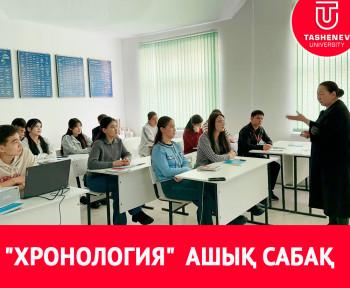 Ашық сабаққа кафедраның ғылым магистрі, аға оқытушылар Турумбетова Гульжан Абубакировна, Дүйсенбек Салтанат Жаңабергенқызы, Момынқұл Нұрай Маратқызы қатысты. «Хронология» тақырыбында жаңа ақпараттар мен фактілер айтылды. Дәріс барысында оқу әдістемелік құрал жабдықтар, анықтамалық әдебиеттер, плакат, презентация, ноутбук, интерактивті тақтамен жұмыс жасалды. Дәріске студенттер белсене қатысып қызығушылығын  оятып,  түрлі  әдіс – тәсілдерді қолдана білген Апашева Сабира Нұрбаевна дәрісті жоғары деңгейде өткізді. Шығармашыл оқытушы  екенін тағы да бір дәлелдеді. Алдағы уақытта тек ізденістер, биік белестер тілейміз!