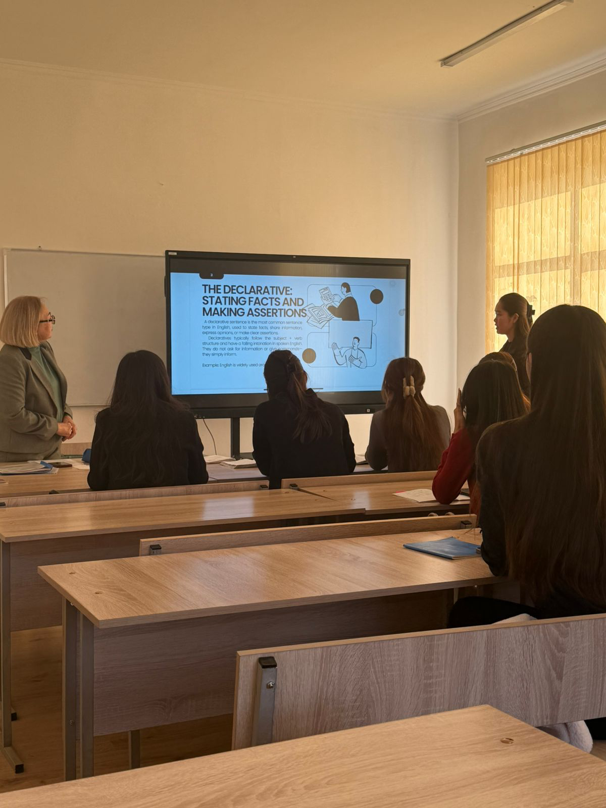 On December 1, 2025, at 12:30, under the guidance of S.T. Mirzagalikova, Senior Lecturer of the “World Languages” Department, an open lesson on the topic “Communicative types of the sentence. Parts of the English sentence” was held in classroom 203 with the participation of students from groups PHI-23-9k-1, 2, and 5.