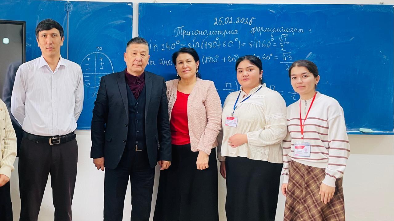 Ж.А. Тәшенев атындағы университетінің «Математика және физика» кафедрасының профессоры, ф.-м.ғ.к. Н.С. Иманбаев пен магистр, аға оқытушы Б.Д. Оразов №77 А.Аскаров атындағы мектеп-лицейінде  25.02.2026 ж. күні сағат 10:40 №207 аудиториясында 6В01501-Математика мұғалімдерін даярлау білім беру бағдарламасының 3-курс ЕП-23-12к3 оқу тобының білім алушылары Мафтуна Равшанбекова мен Маржона Рахманкулованың 9А сыныбында өткізген «Тригонометрия формулалары» атты ашық сабақтарына қатысып келді.