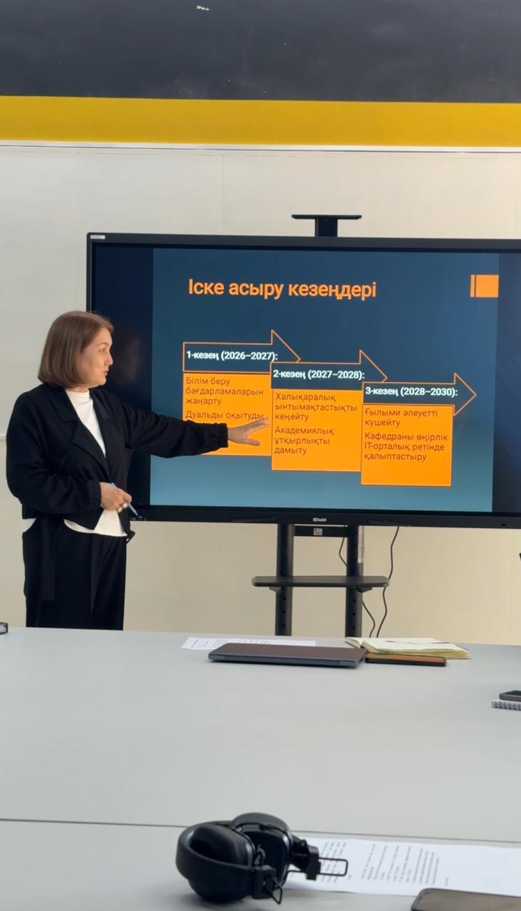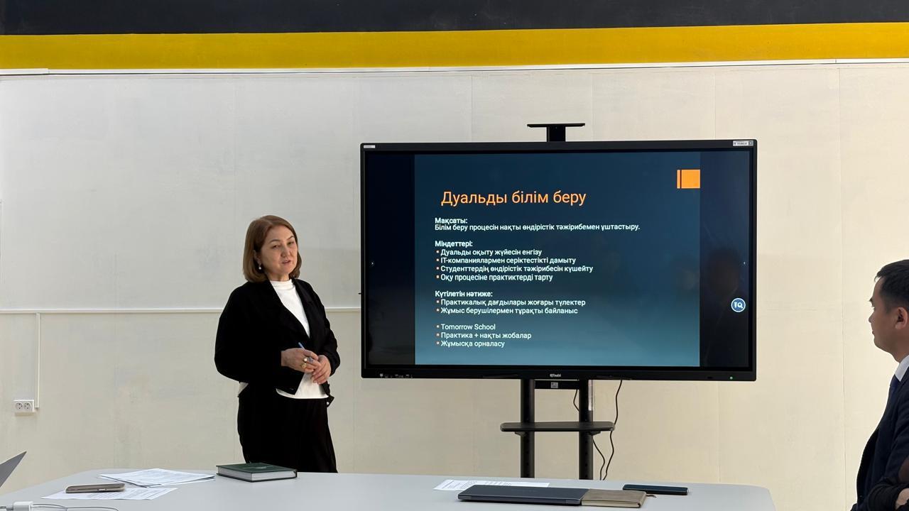 Согласно повестке дня директор «Tomorrow School» У.Н. Сламбеков представил концепцию инновационной IT-школы. Заведующая кафедрой С.Б. Ботаева представила стратегический план кафедры и остановилась на вопросах совершенствования образовательных программ.