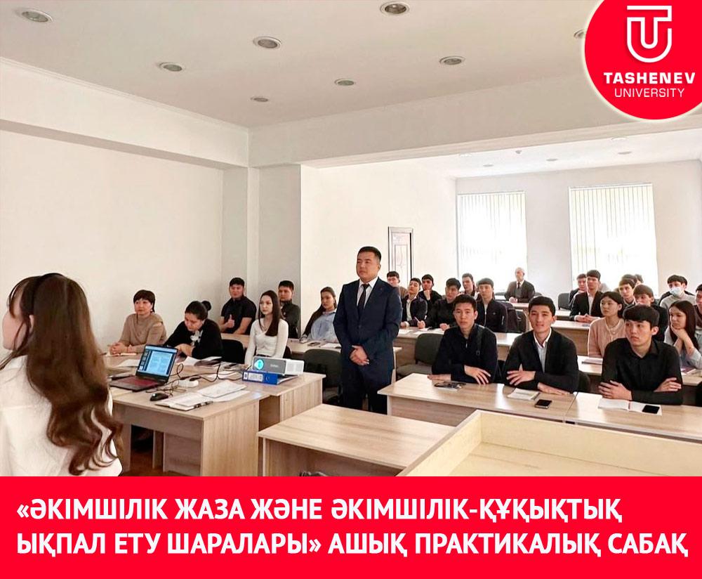 21.04.2025ж., сағат 10:30, 315 аудиториясында «Құқық және бизнес» кафедрасының магистр оқытушысы Улыкбеков Н.К. «ҚР Әкімшілік құқығы» пәнінен, «Әкімшілік жаза және әкімшілік-құқықтық ықпал ету шаралары» тақырыбында ашық практикалық сабағын өтті. Практикалық ашық сабақ алдын-ала дайындалған мультимедиялық көрнекі құралдарды қолдану негізінде жүзеге асырылды. Практикалық ашық сабақтың әрбір сұрағын ашуда оқытушы көрнекілік принципін негізге алып, интерактивті оқыту әдістерін қолдану арқылы білім алушылардың қызығушылығын арттыра білді. Ашық практикалық сабақты сергіті сәтімен бастап, білім алушы студенттердің қызығушылығын арттырды. Тақырыпты ашу барысында топ студенттерімен кері байланыс орнатылды, берілген сұрақтарға жауап берді; берілген ситуациялық тапсырмаларға жауап берді, тақырыпты оқытушы аша білді. Сондай-ақ оқытушы тақырыпты қорытындылау барысында тақырып бойынша құрастырылған тест тапсырмасы шешілді.