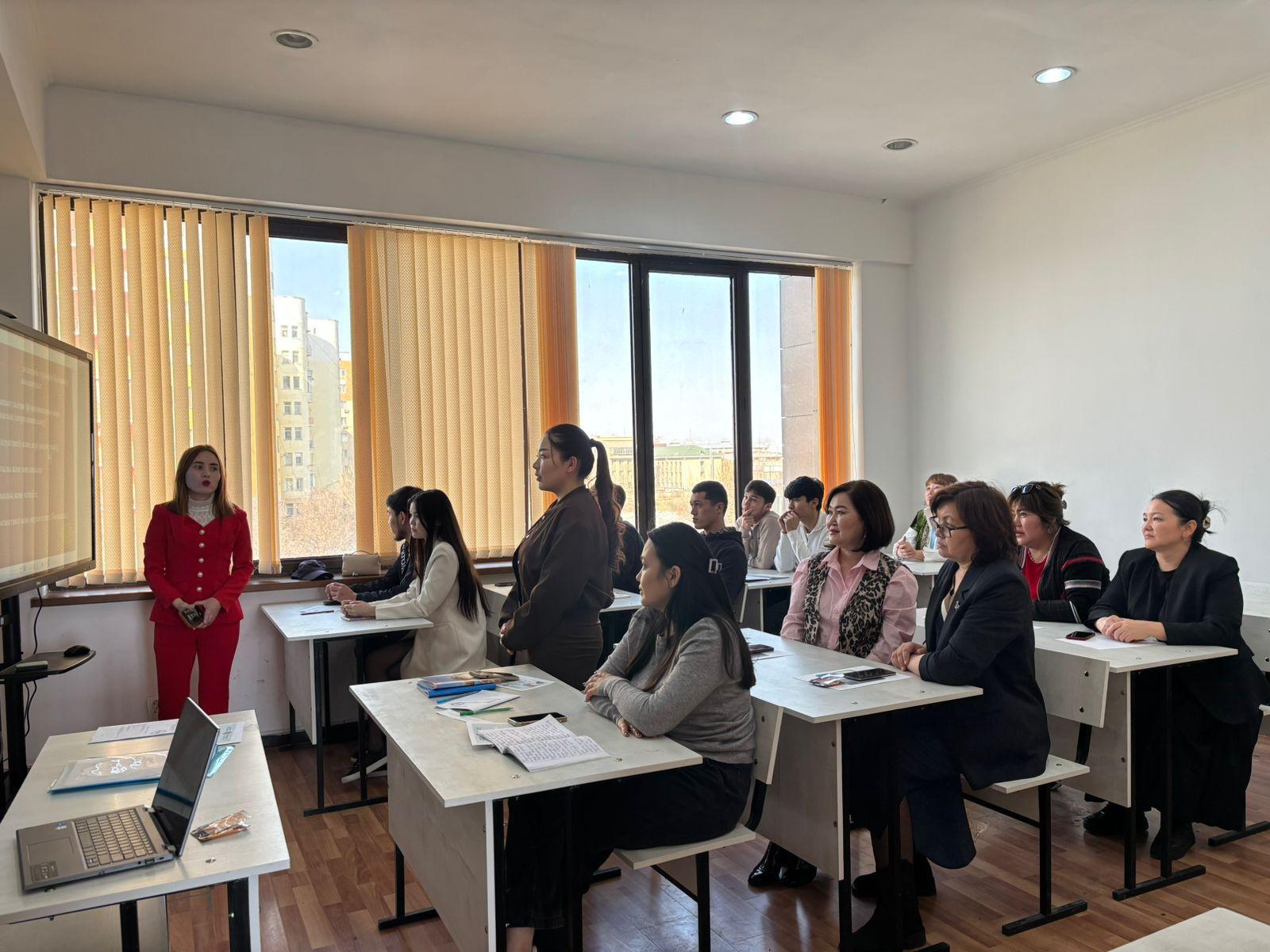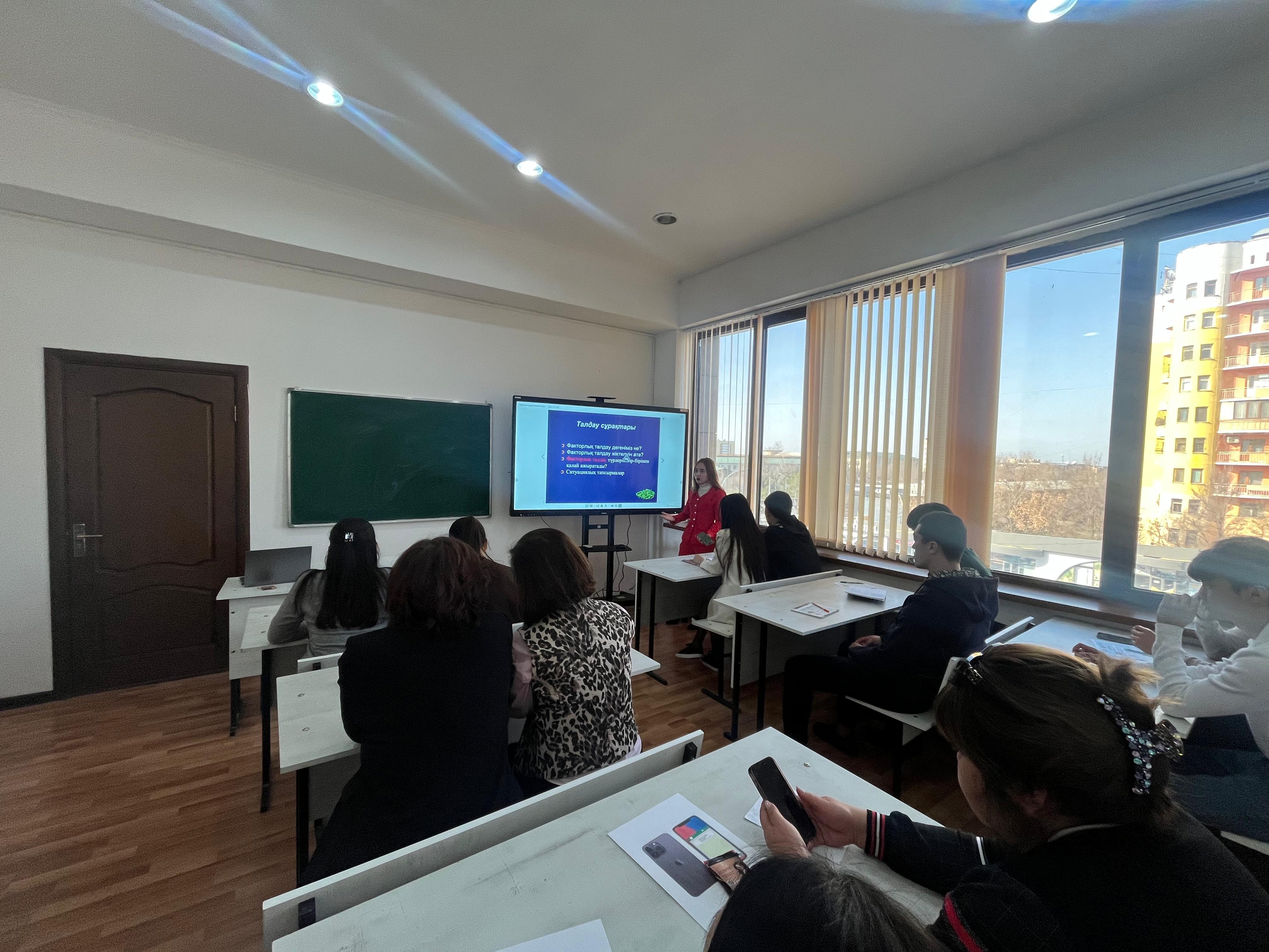19.02.2026 ж. «Экономика және менеджмент» кафедрасының аға оқытушысы Гүлсезім Жасанқызы 6В04101 – «Есеп және аудит» білім беру бағдарламасының 3 курс, ИЭФ-23-2к топ студенттерімен «Факторлық талдау» тақырыбында ашық практикалық сабақ өткізді.