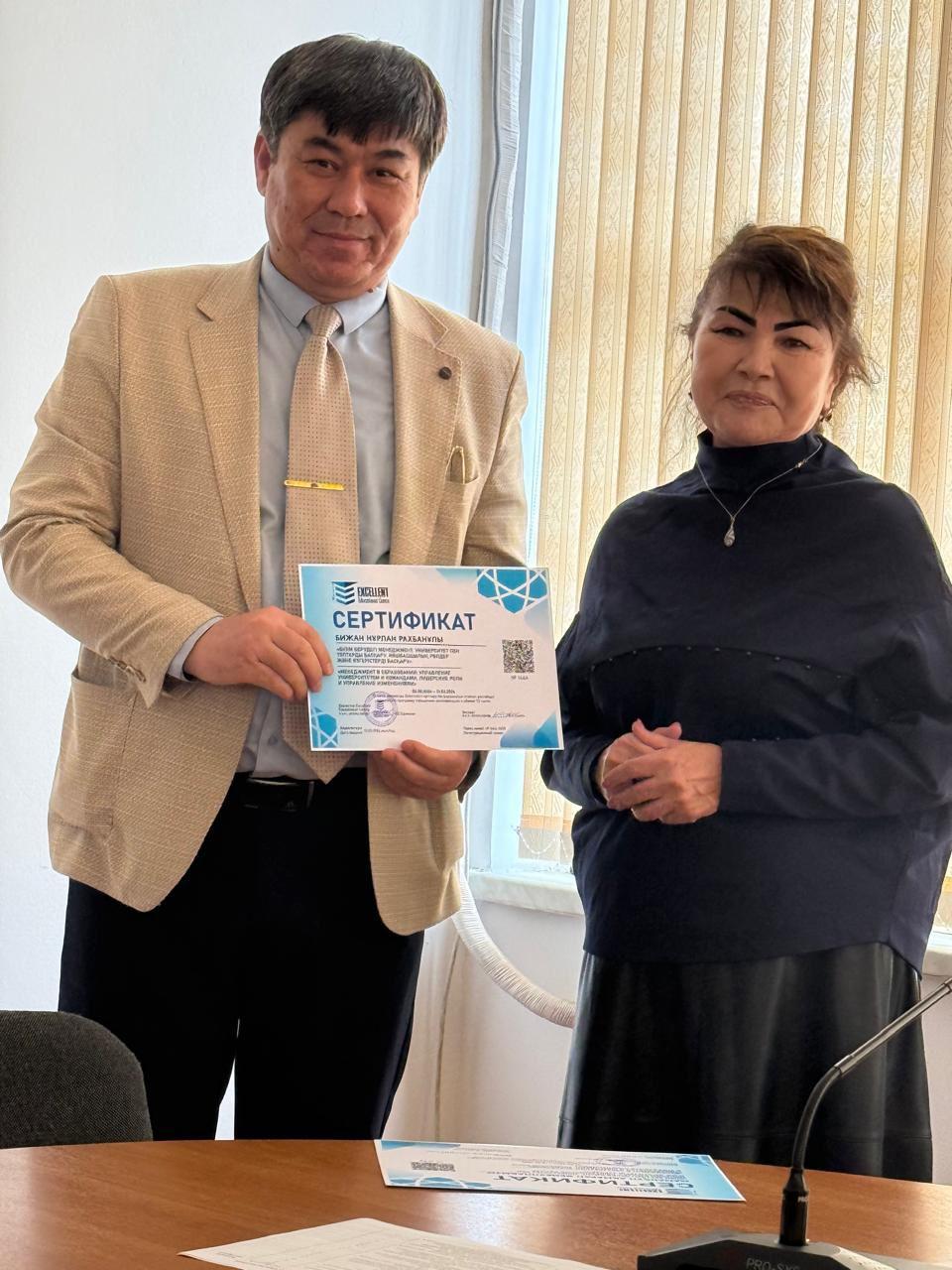 - «Құқық» кафедрасының меңгерушісі Нұрлан Бижан «Менеджмент» бағыты бойынша мамандандырылған курсты сәтті аяқтап, тиісті сертификат алды.