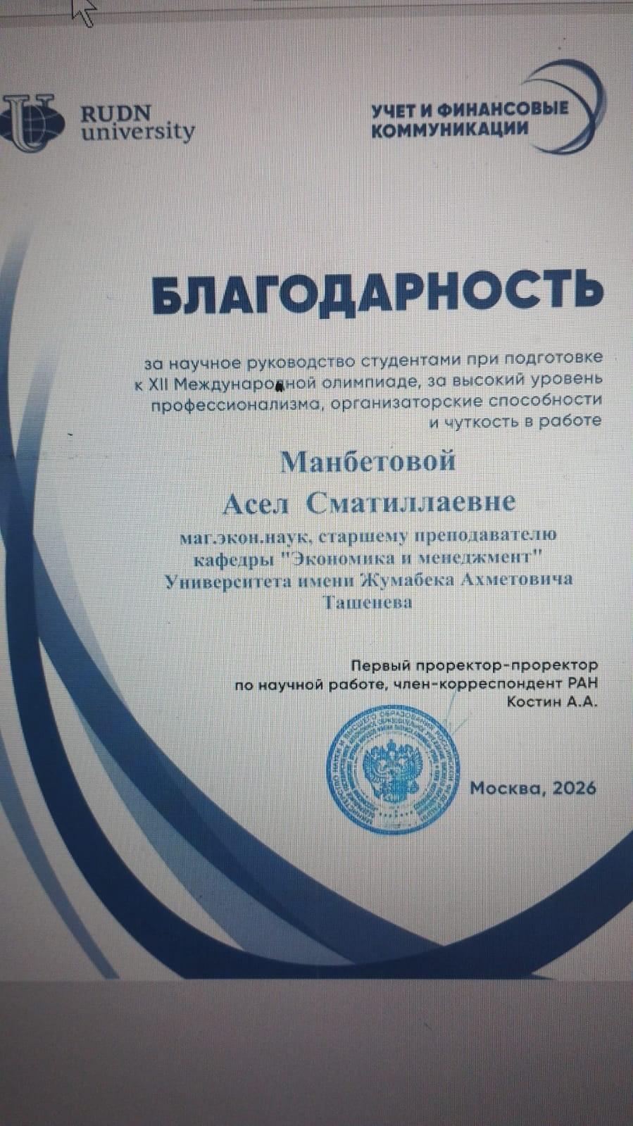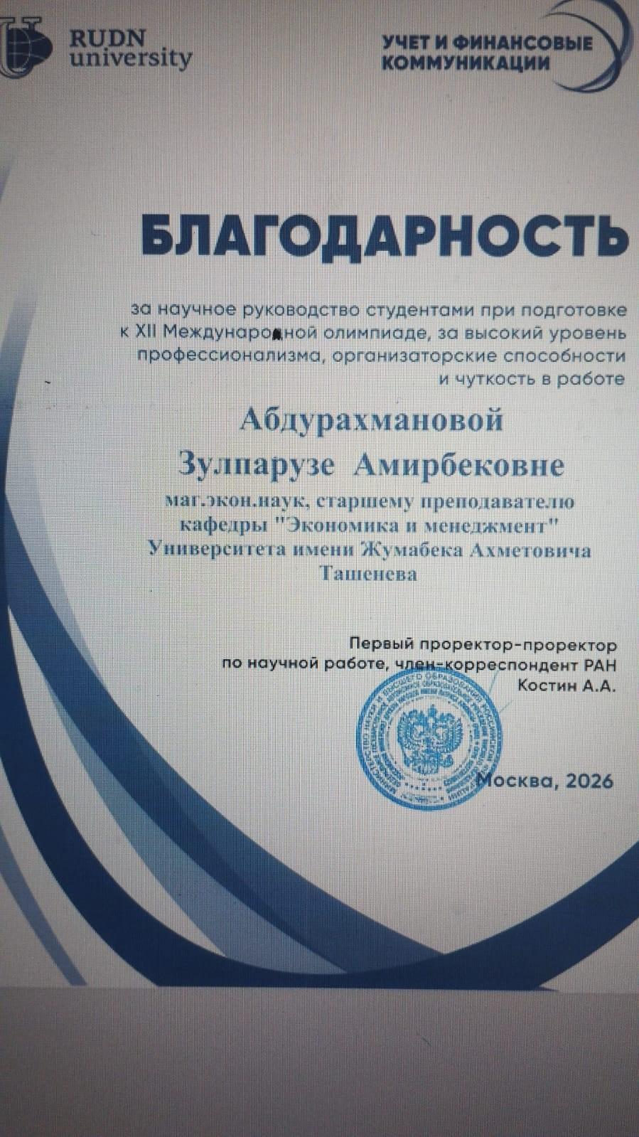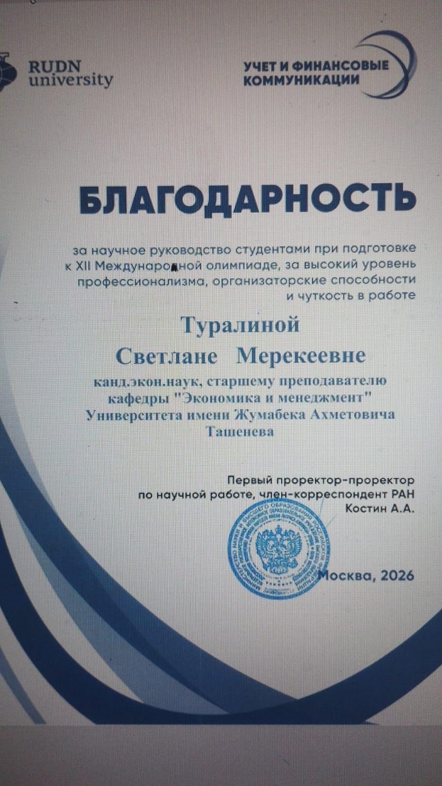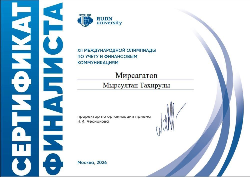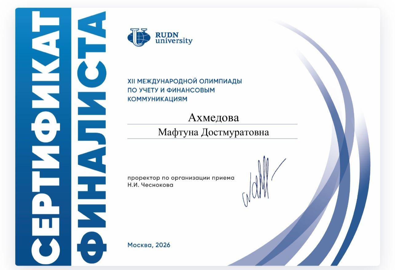С 26 марта по 28 марта 2026 года профессорско-преподавательский состав кафедры «Экономика и менеджмент», студенты 1,2,3 курсов по образовательной программе бакалавриат «6В04101 – Учет и аудит», «6В04102 – Финансы», «6В04103 – Экономика», Магистратура «7М04101- Экономика», «6В04105- Государственное местное управление» Аматниязов Бобур, Амакүл Жанибек, Ахмедова Мафтуна, Розкулова Севинч, Мирсагатов Мырсултан приняли участие в ХІІ Международной олимпиаде по учету и финансовым коммуникациям Российском университете Дружбы народов г. Москвы. Наши студенты решали кейсы, тесты, а также защищали проекты и вышли в финал, где были нагарждены сертификатами финалиста.