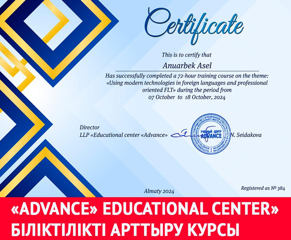 В период с 16 сентября по 18 октября 2024 года профессорско-преподавательский состав университета имени Ж.А. Ташенева прошли курс повышения квалификации по читаемым дисциплинам в г.Алматы «Educational center «Advance» в объеме 72 часов. Курс направлен на развитие коммуникативных навыков по дисциплинам образовательной программы «Иностранный язык: два иностранных языка.