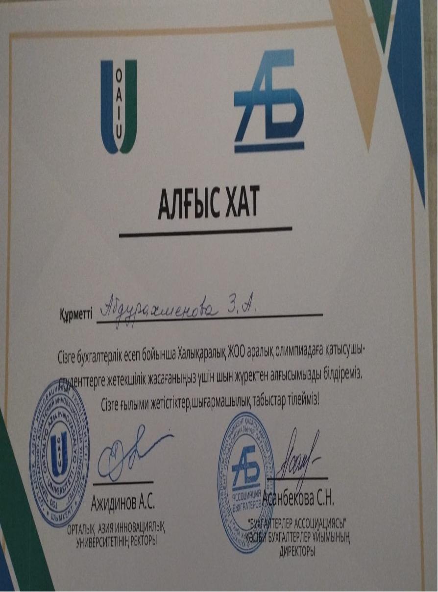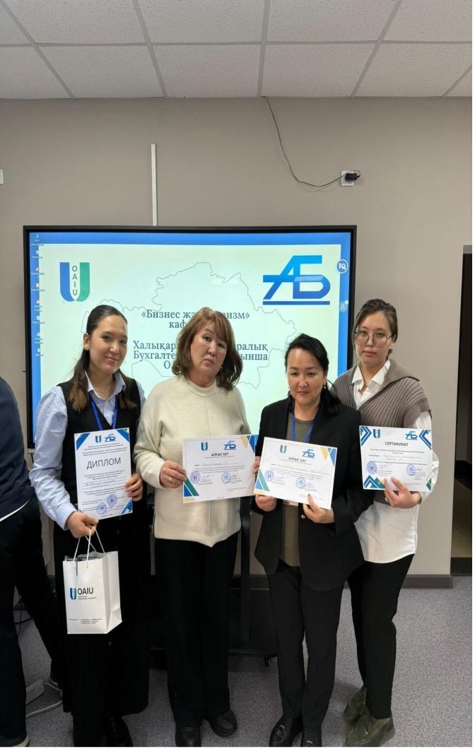 8 октября 2025 года в университете «Мирас» проводился городской межвузовский интеллектуальный турнир по бухгалтерскому учету среди обучающихся образовательных программ 6В04101- «Учет и аудит», 6В04102 – «Финансы», 6В04103 – «Экономка». В турнире участвовали студенты 1,2 курсов кафедры «Экономика и менеджмент» команда «IQ - Баланс» Аманов Куаныш, Ахмедова Мафтуна, Үшкемпір Асылай, Байбол Аида. Научный руководитель: м.э.н., старший преподаватель Абдурахманова Зулпаруза Амирбековна.