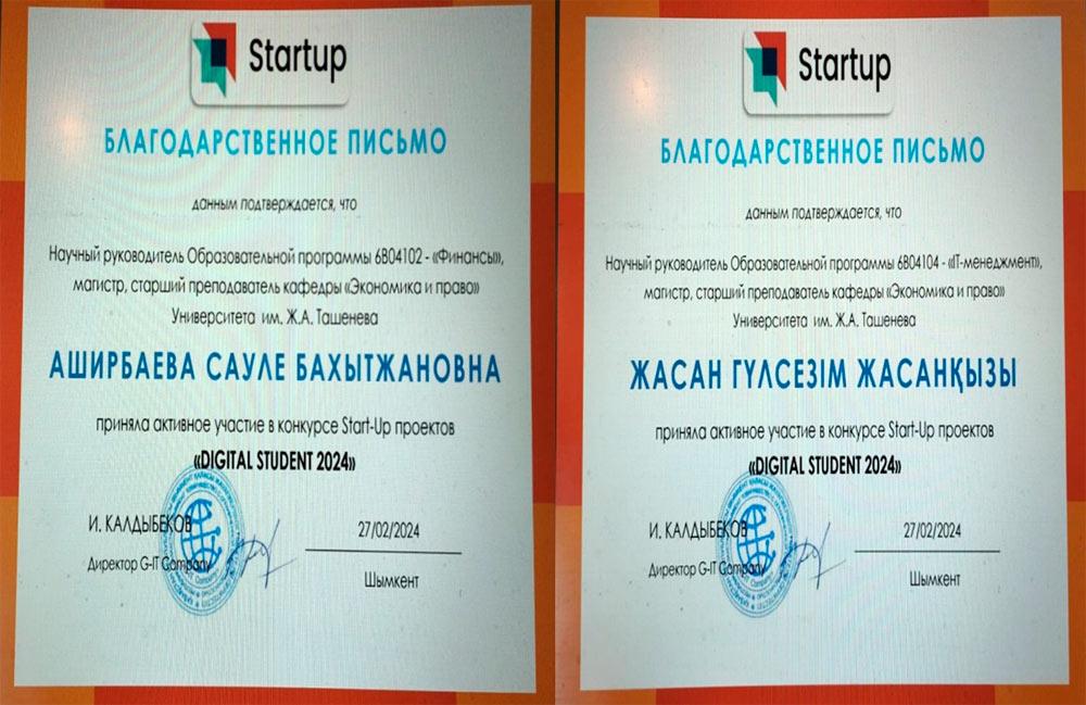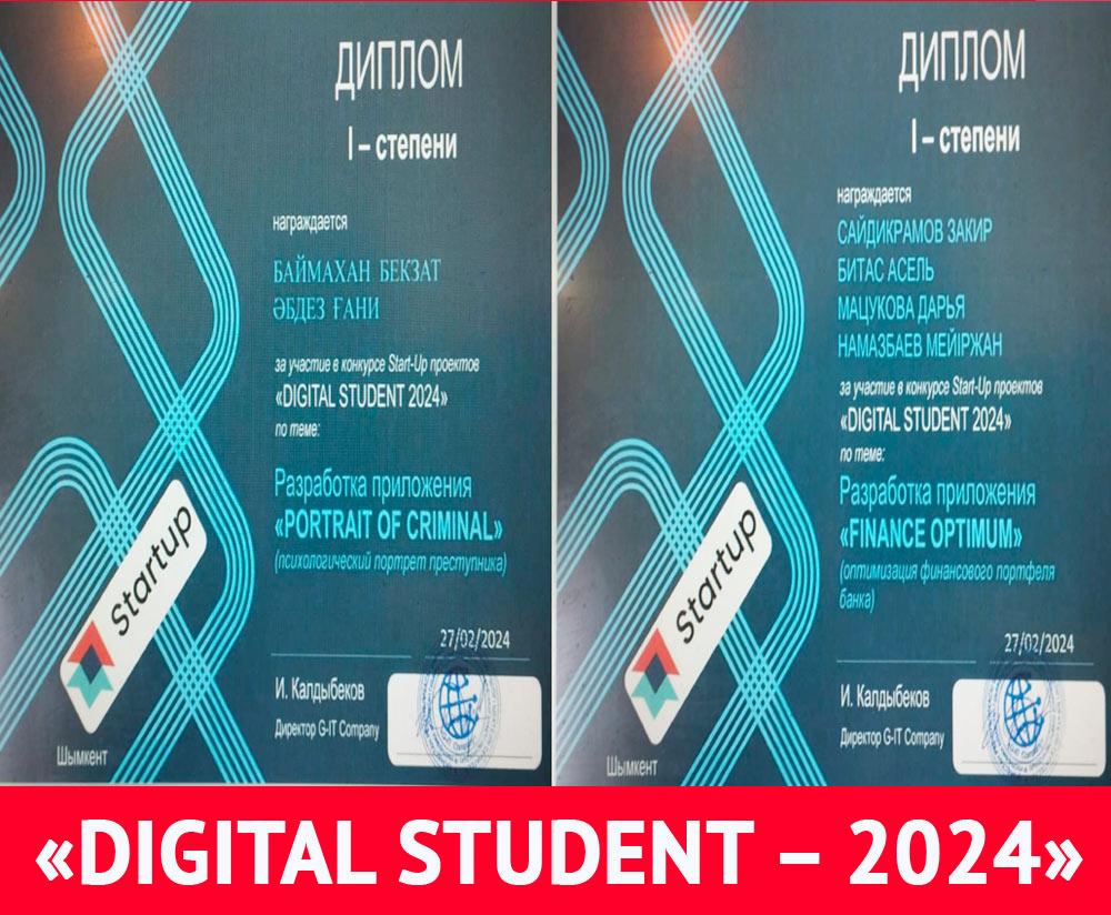 2024 жылдың 27 ақпан күні «Экономика және құқық» кафедрасының студенттері Star-up жоба «DIGITAL STUDENT – 2024» конкурсына қатысты. Конкурсқа 2 курс студенттері 6В014-«Бизне управление» бағыты білім беру бағдарламасы бойынша: 6В04101 - «Учет и аудит» Сайдикрамов Закир, 6В044102 - «Финансы» - Битас Асель, 6В04103 -«Экономика» - Мацукова Дарья, 6В04104 - «IT-менеджмент» - Намазбаев Мейіржан тақырыбы: «Разработка приложения «FINANCE OPTIMUM» (оптимизация финансового портфеля банка)»». және 2 курс студенттері 6В049 - «Құқық» бағыты білім беру бағдарламасы бойынша: 6В04202 - «Бизнес и право» - Баймахан Бекзат, 6В04201 - «Правоведение» - Әбдез Ғани, тақырыбы: «Разработка приложения «PORTRAIT OF CRIMINAL» (психологческий портрет преступника) жобаларын қорғап І-дәрежелі дипломмен марапатталды.