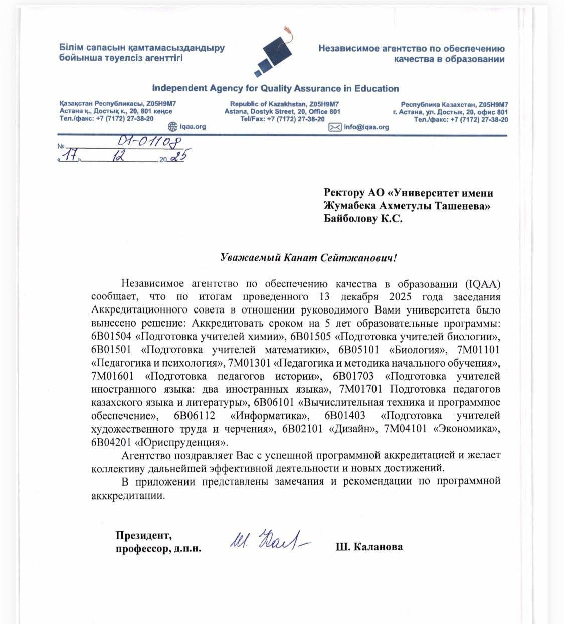 5 жылдық бағдарламалық аккредитациядан өту Tashenev University-дің білім беру сапасының тұрақтылығын, бағдарламалардың заманауи талаптарға сәйкестігін және университеттің академиялық даму мен сапа қағидаттарына берік екенін айғақтайды.