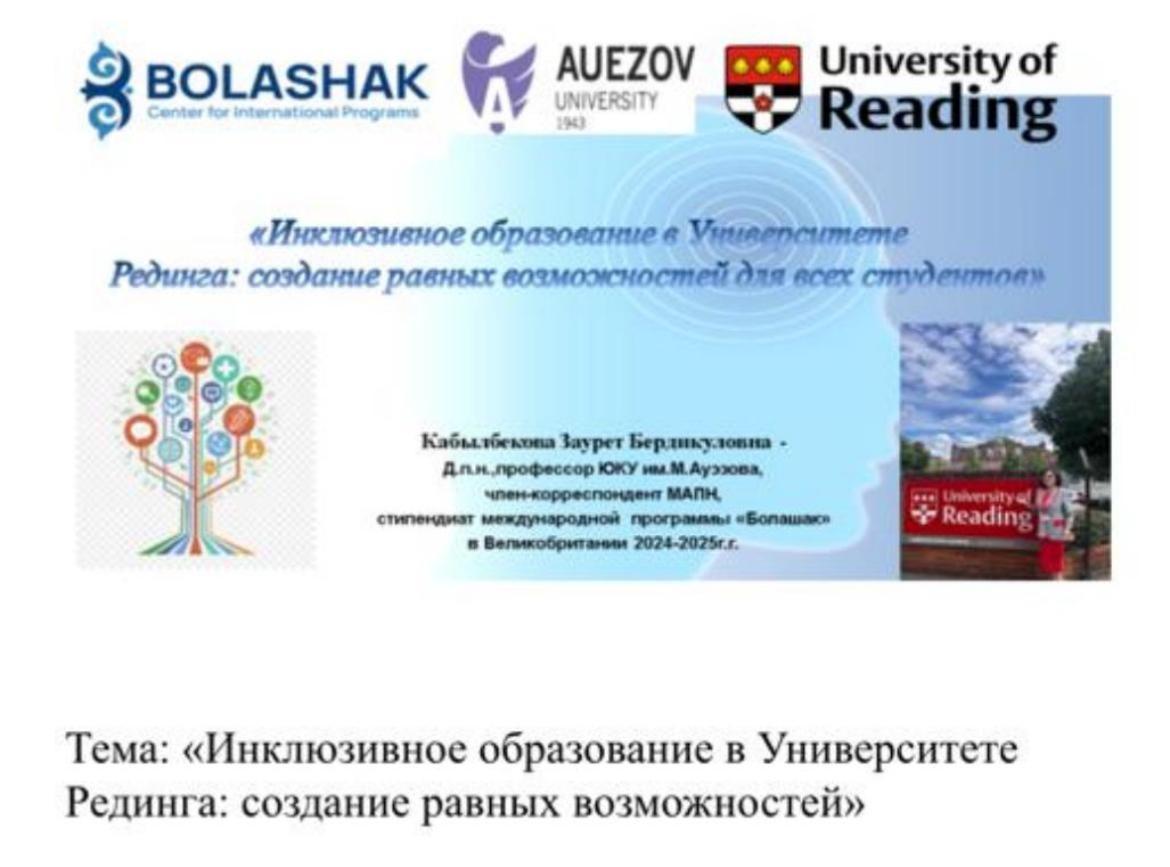 20.02.2026 жылы Тәшенев университеті, «Педагогика және психология» кафедрасының арнайы шақыртуымен М.Әуезов атындағы ОҚЗУ, “Жалпы педагогика және психология” кафедрасының профессоры, Халықаралық “Болашақ” бағдарламасының стипендиаты (Ұлыбритания: 2024-2025о.ж)педагогика ғылымдарының докторы Заурет Бердіқұлқызы Қабылбекова “Инклюзивное образование в Университете Рединга: создание равных возможностей для всех студентов” атты тақырыбымен тәжірибе алмасуға бағытталған ғылыми семинарын өткізді.