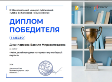 Professor of the Department of Design and Fashion V.M. Dzhanpaizova continues to actively develop the scientific and educational direction of the university, demonstrating high results in her professional activities. As part of her scientific and methodological work, she published the textbook "Kim designindagy materialanu negizderi", dedicated to the basics of materials science in fashion design. This publication aims to provide students with up-to-date knowledge about the properties of materials, their application and their role in the costume design process.