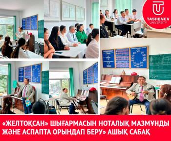Ж.А.Тәшенев атындағы университеті «Бастауыш білім және өнер» факультеті «Саз және ән» кафедрасының ҚР мәдениет қайраткері, доцент Бөрі Иса 26.09.2024 күні ПиК-24-4к және Пик-24-13к топ студенттерімен «Желтоқсан» шығармасын ноталық мазмұнды және аспапта орындап беру тақырыбы бойынша ашық сабағын өтті. «Желтоқсан» шығармасының шығу тарихын және оның орындалу ережесімен таныстыра отырып,оқытушы студенттермен шығарманың әрбір тактісін,ноталық мәтінін жоғары деңгейде талдай білді.Сабақты өту барысында оқытушы жаңа әдістерді қолдану арқылы шығарманың мәнін аша тусті.Сабаққа факультетіміздің деканы Ұ.Ж.Қонақбаева және кафедра меңгерушісі Д.К.Азизханова,кафедраның профессор құрамы толығымен қатысты. Сабақ жоғары дәрежеде өтті.