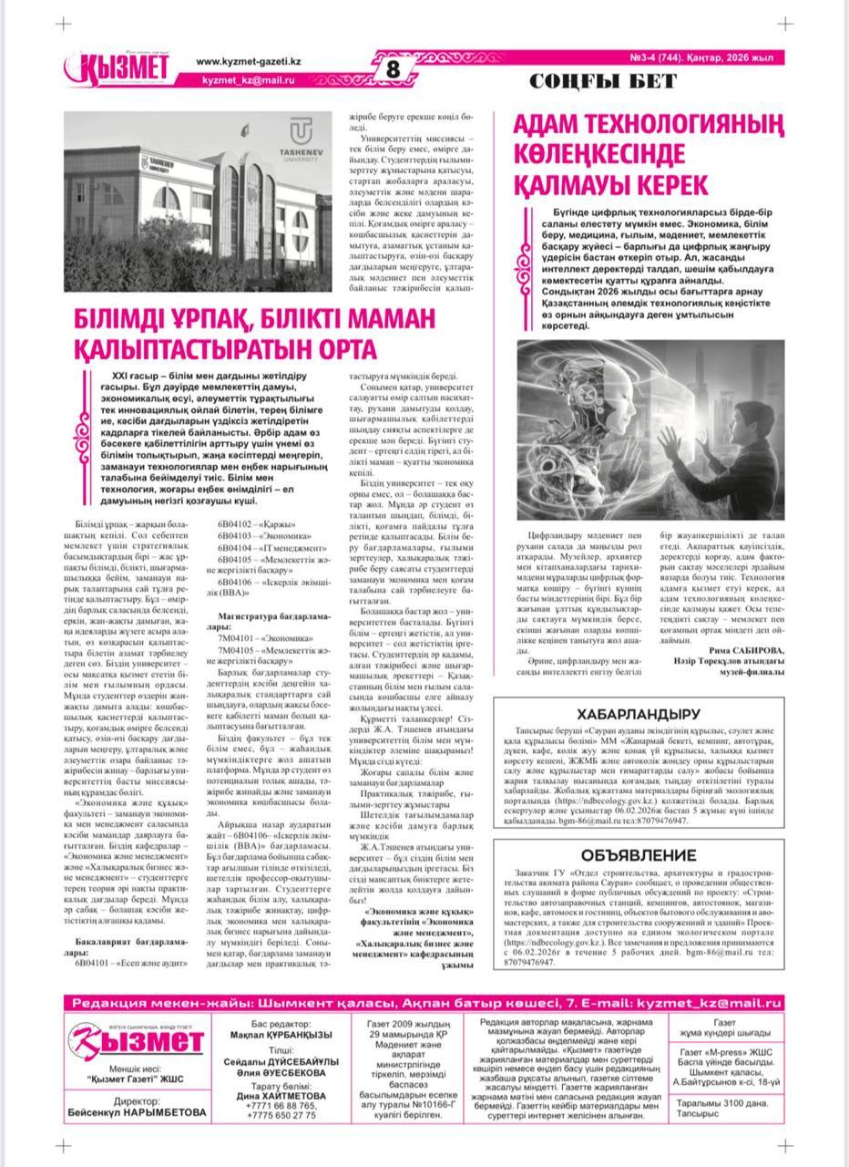 Медиатека / Жаңалықтар / Экономика және құқық факультетінің ұжымы Ташенев университеті туралы тағы бір имидждік мақала жариялады. (Kyzmet.kz газеті,8 басылым)