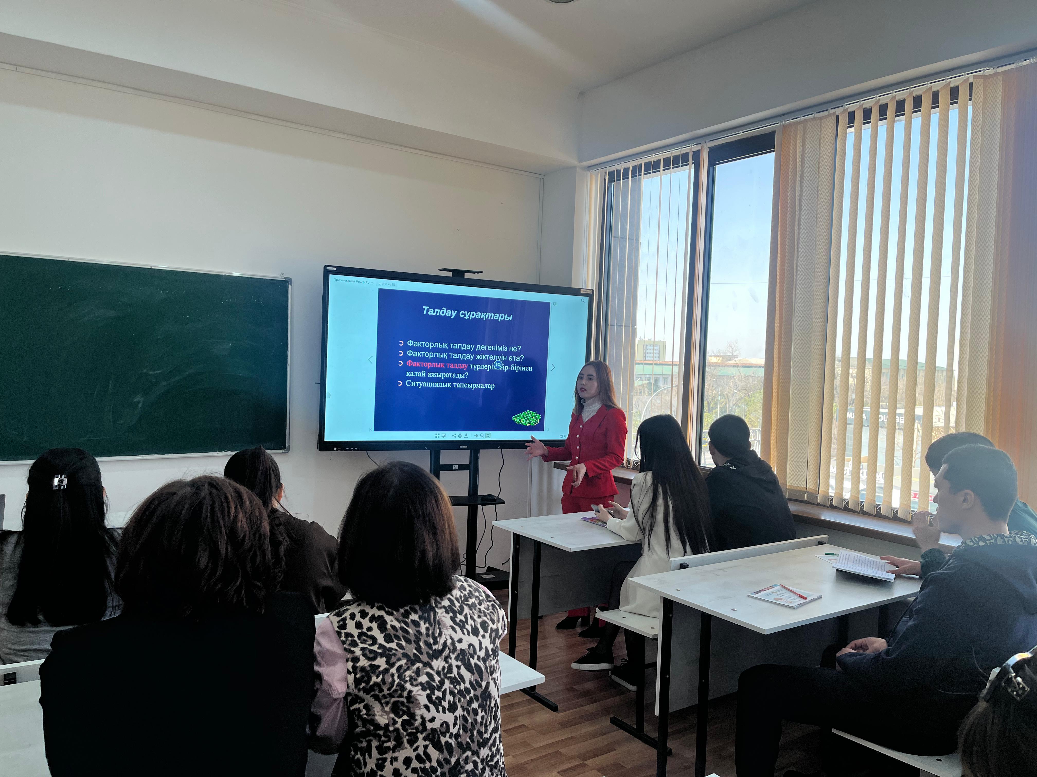 19.02.2026 ж. «Экономика және менеджмент» кафедрасының аға оқытушысы Гүлсезім Жасанқызы 6В04101 – «Есеп және аудит» білім беру бағдарламасының 3 курс, ИЭФ-23-2к топ студенттерімен «Факторлық талдау» тақырыбында ашық практикалық сабақ өткізді.