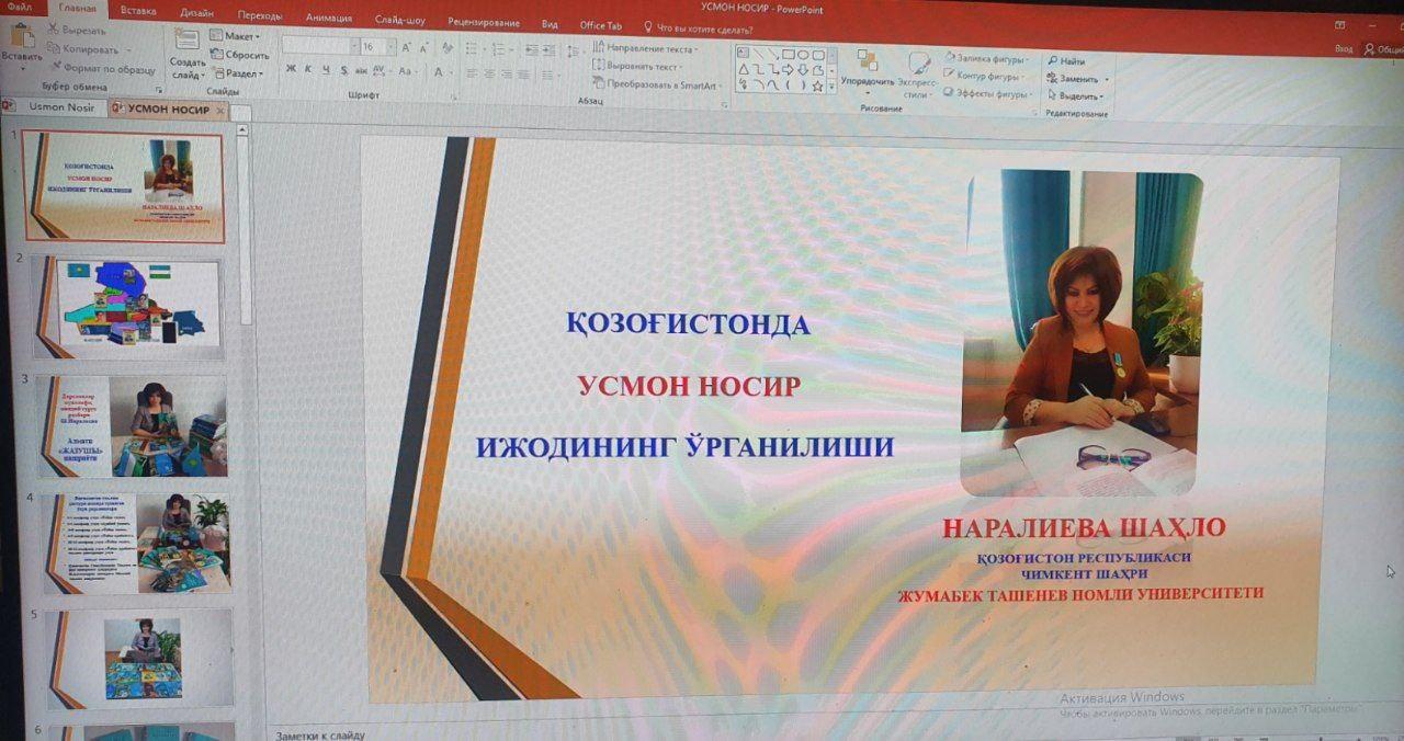 Конференция барысында Жұмабек Тәшенев атындағы университеттің Халықаралық байланыстар департаментінің директоры, PhD доктор Шахло Наралиева сөз сөйлеп, Қазақстандағы өзбек тілінде оқытатын мектептердің оқу бағдарламасында Усман Насыр мұрасының алатын орны туралы тәжірибе бөлісті. Сондай-ақ, филология ғылымдарының докторы Хулкар Хамроеваның ақын шығармашылығын зерттеудегі тың пікірлері жоғары бағаланды.
