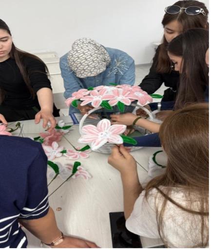 2026 жылғы 27 наурызда «Өнер және көркем еңбек» кафедрасының 6В01406-«Көркем білім»(IP) білім беру бағдарламасы, ПиК-24-1к1, ПиК-24-1к2 және ПиК-24-1к3 топтарында өткізілген ашық практикалық сабақ болашақ көркем білім беруде кәсіби құзыреттілікті қалыптастыруға бағытталды. Сабақ барысында магистр, аға оқытушы Н.М.Көбеева интерактивті технологияларды қолдана отырып, студенттерді өзін-өзі бағалау және өзара бағалау әдістерімен таныстыру, олардың оқу процесіндегі маңызын түсіндіру, студенттердің рефлексия және бағалау дағдыларын дамыту және басқа да теориялық мәселелер қамтылды. Пән бағдарламасында қарастырылған «Білім алушылардың өзін-өзі бағалауы және өзара бағалау» тақырыбы аясында студенттер 3 түрлі гүлдер композициясын ұсынды. Ашық практикалық сабақтың мақсаты – студенттердің кәсіби білімін, іскерлігі мен дағдыларын қалыптастыру, шығармашылық ойлау қабілетін дамыту. Топтарға бөлінген студенттер лента,шинельді сым, қағаз, пластик, және түрлі қаптама материалдарын пайдалана отырып, ерекше гүл букеттерін дайындады. Тақырыпқа сай, сабақтың соңында студенттер өздерін және бір-бірін өзара бағалау арқылы сабақты қорытындылады. Аталған ашық сабақ студенттердің пәнге деген қызығушылығын арттырып, шығармашылық ізденістеріне серпін берді деп сенеміз. Сабақ жоғары ғылыми-әдістемелік және педагогикалық деңгейде өткізілді.
