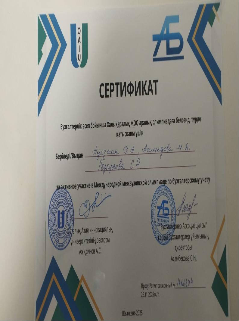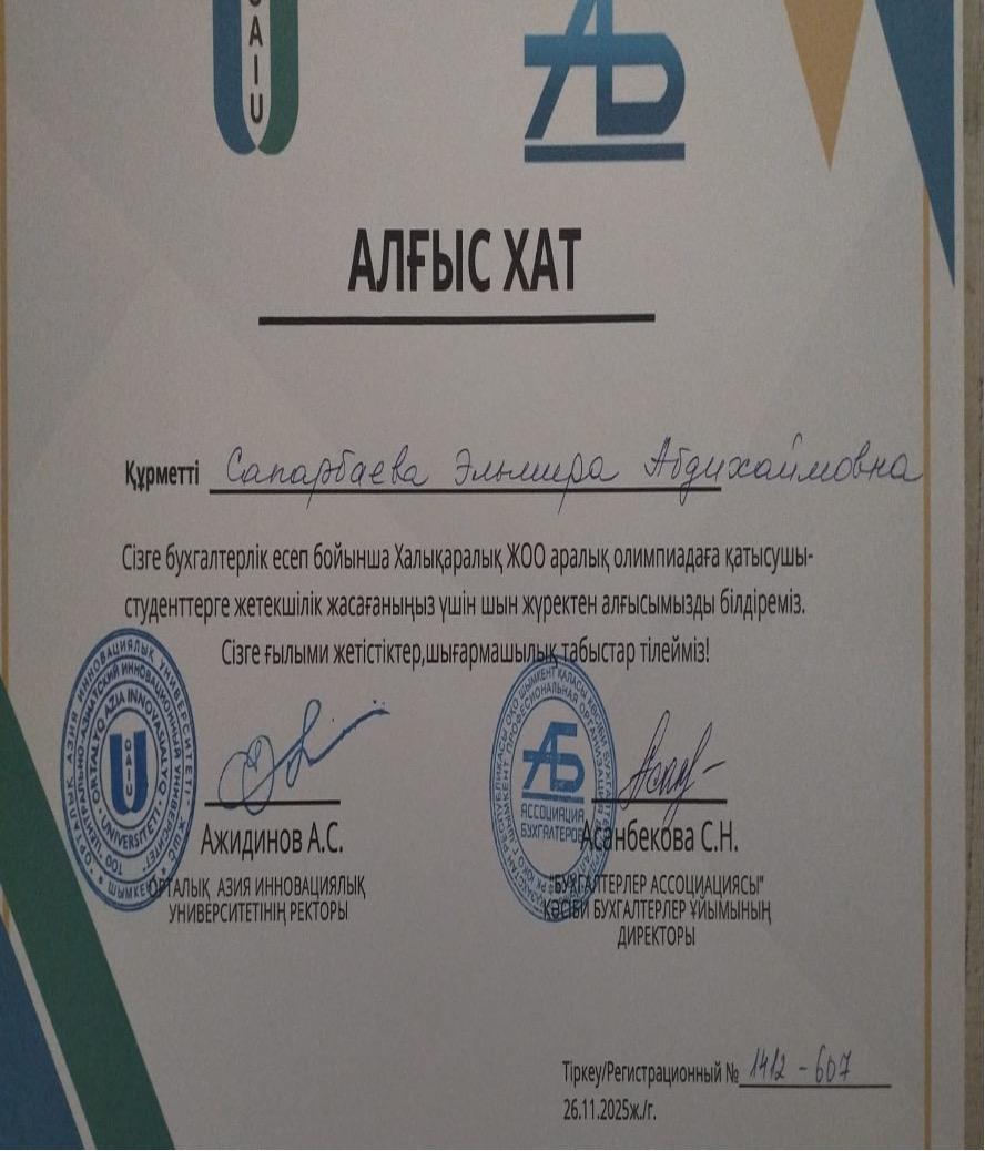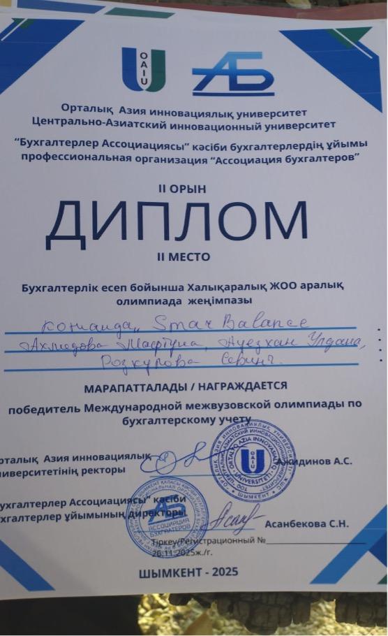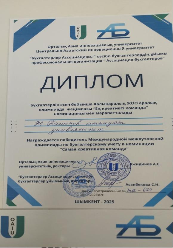 8 октября 2025 года в университете «Мирас» проводился городской межвузовский интеллектуальный турнир по бухгалтерскому учету среди обучающихся образовательных программ 6В04101- «Учет и аудит», 6В04102 – «Финансы», 6В04103 – «Экономка». В турнире участвовали студенты 1,2 курсов кафедры «Экономика и менеджмент» команда «IQ - Баланс» Аманов Куаныш, Ахмедова Мафтуна, Үшкемпір Асылай, Байбол Аида. Научный руководитель: м.э.н., старший преподаватель Абдурахманова Зулпаруза Амирбековна.