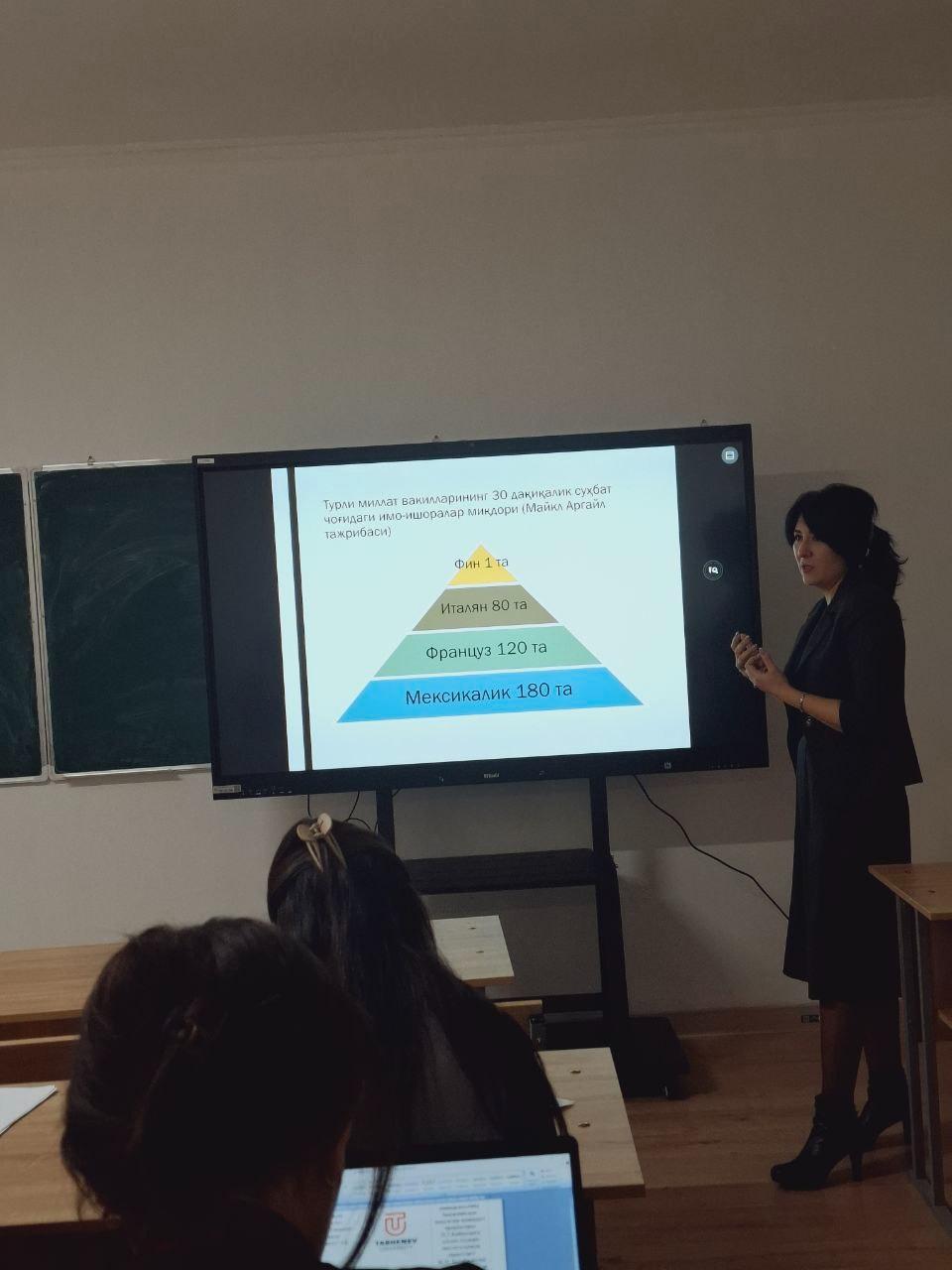 13 декабря 2025 года Исматуллаева Наргиза Расуловна, доцент Ташкентского государственного университета востоковедения, прочитала гостевые лекции студентам 2-3 курсов бакалавриата и магистрантам кафедры «Русский и узбекский языки» Института мировых языков Университета имени Жумабека Ташенева.